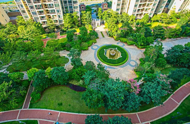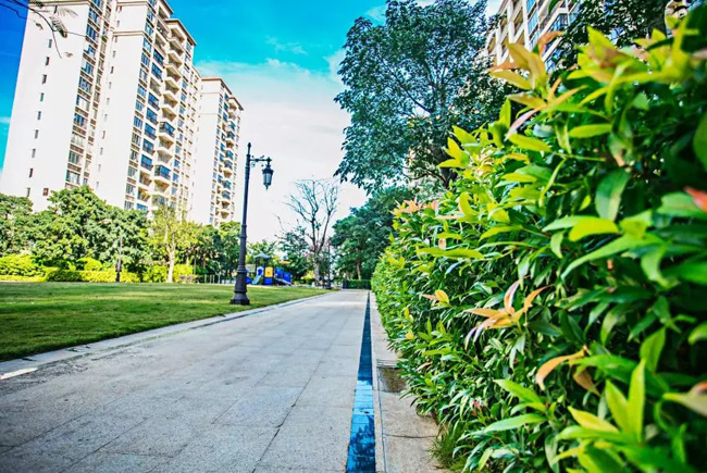 园林硬质景观小区园路边带采用多棕红色厚陶土砖进行大规模园路铺设,进行蓄水和排水。使整个项目成为了海口市“原生态”小区的示范区,达到生态城市建设的标准。