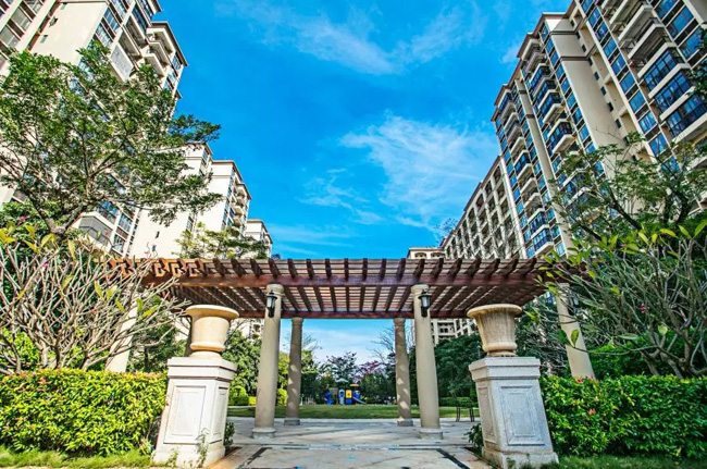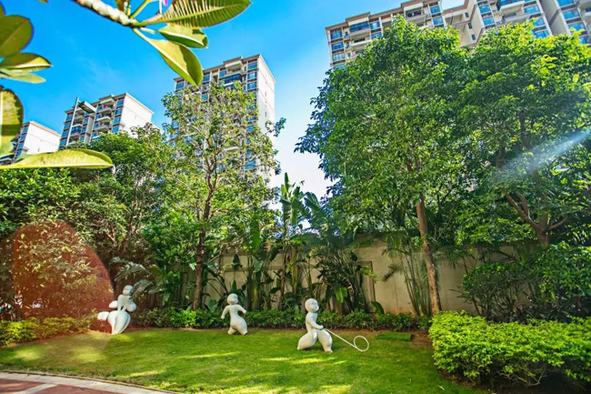 在景观结构设计上,该项目景观绿化多采用适宜海南区域性生长的植物进行搭配,体现海云天景观结构。在季节性开花植物与常绿植物,阔叶与落叶植物、绿叶与非绿叶等的组团形式展示植物多样性,体现森林城市生态人居的构想。
